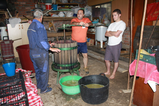 When we returned this afternoon we placed the stomped on white grapes in a press, to remove all of the stems and seeds from the fermented pulp. Gonzalo has a press, whereas when a crank at the top is turned, pressure is applied to the pulp below, squishing out the juice. The fermented grape stems, skins, and seeds are later used to make aguardiente ("fire water"), which is a clear 100-120 proof liquor (I find it absolutely painful and the most unpleasurable thing I could ever imagine).